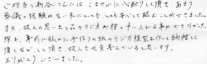 担当の新谷さんにはこまやかに心配りして頂き、あまり葬儀の経験がない私にとっても、とても安心して臨むことができました。また、故人の思い出の品のラジオが棺の中に入れる事ができなかった際も、事前に秘かに手作りの紙のラジオ模型を作って、納棺して頂くなどして頂き、故人も大変喜んでいると思います。ありがとうございました。
