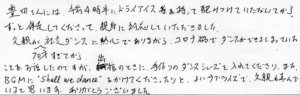 豊田さんには、午前4時半にドライアイスを持って駆けつけていただいてから、ずっと伴走してくださって、親身に対応していただきました。父親が70才すぎてから社交ダンスに熱心でありながら、コロナ禍でダンスができなくなっていたことをお話したのですが、出棺のときに、手作りのダンスシューズを入れてくださり、また、BGMに“Shall we dance” をかけてくださったりと、よいサプライズで父親も喜んでいると思います。ありがとうございました。